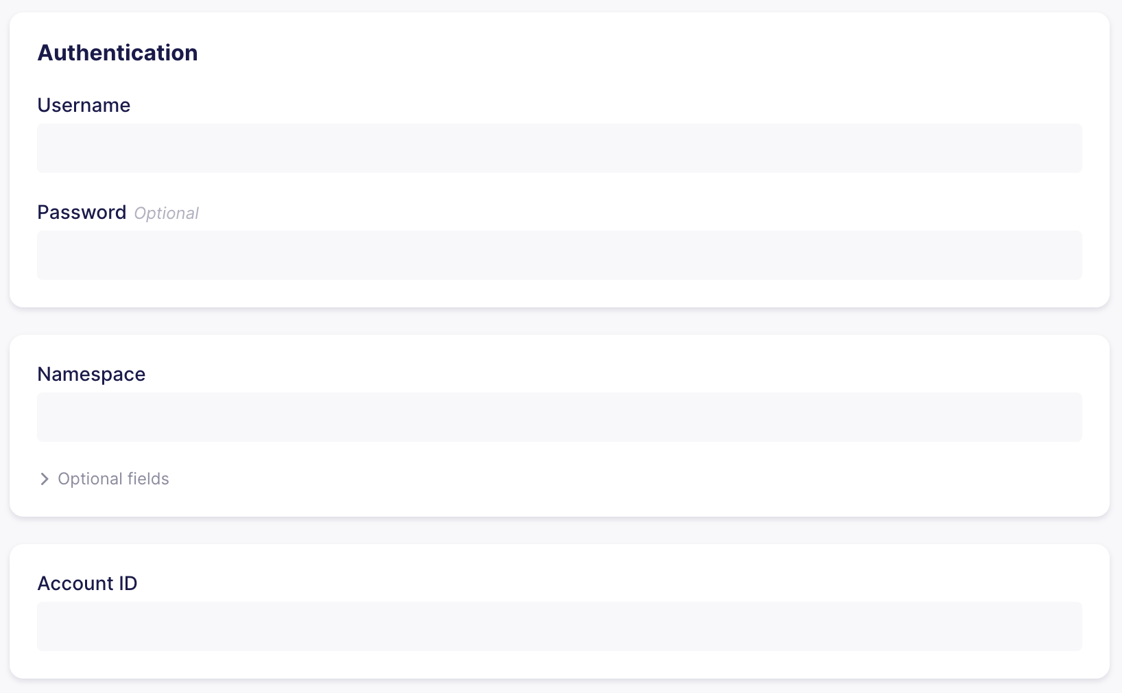Fields in the connector spec can be grouped into cards in the UI by utilizing the group property on a field. All fields that share the same group value will be grouped into the same card in the UI, and fields without a group will be placed into their own group card.